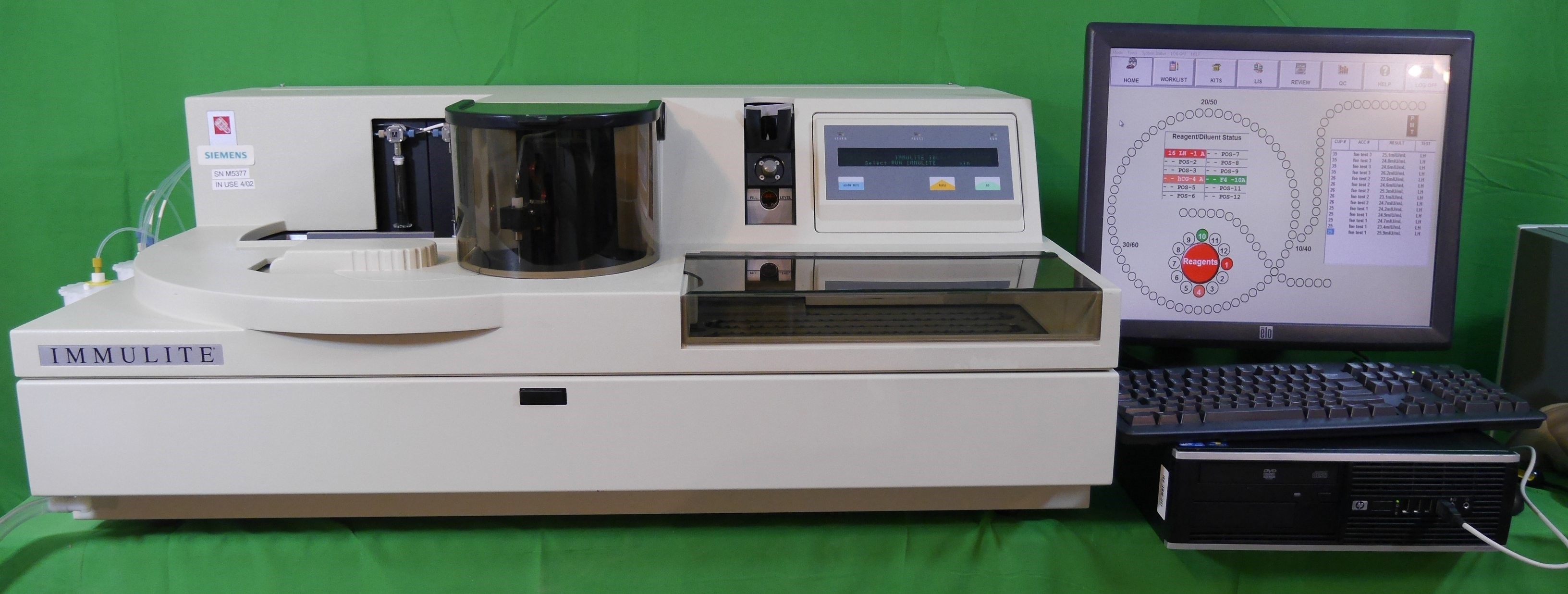 The serum sample is manually dispensed in the device by the user; the instrument will automatically perform all the operations (dilutions, dispensantions, wahings, photometric readings). The results are printed by the internal thermal printer or sent to the host computer through the Laboratory Information System.